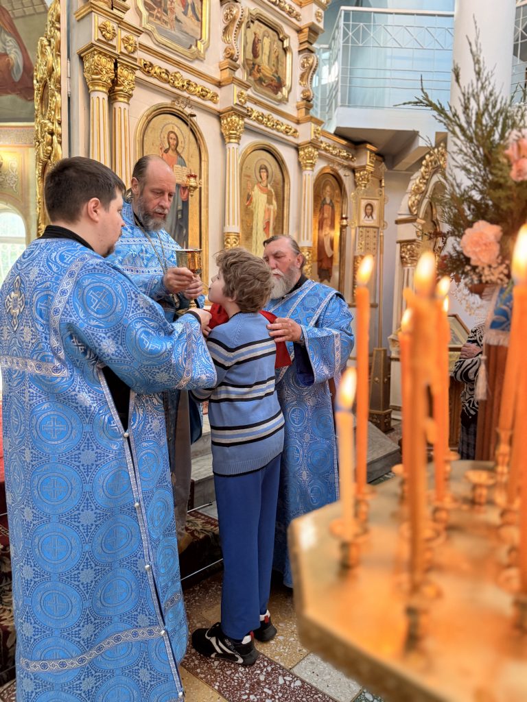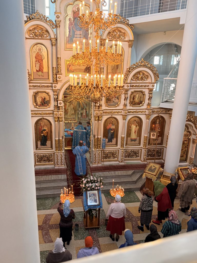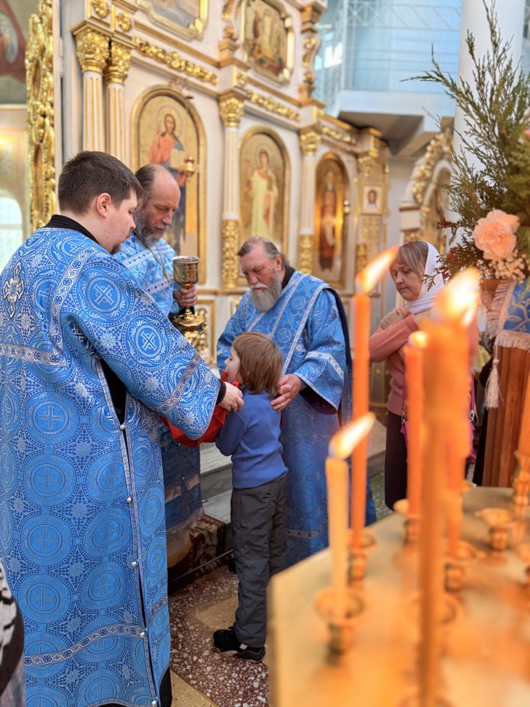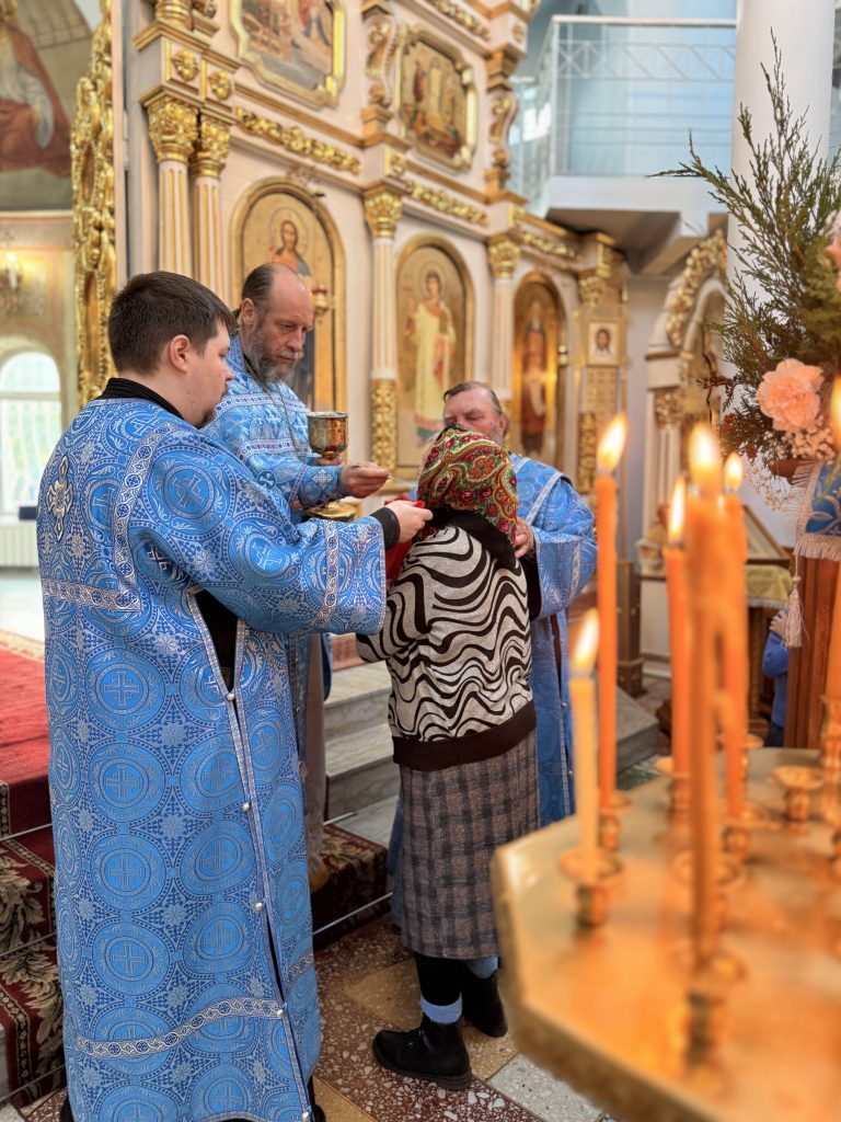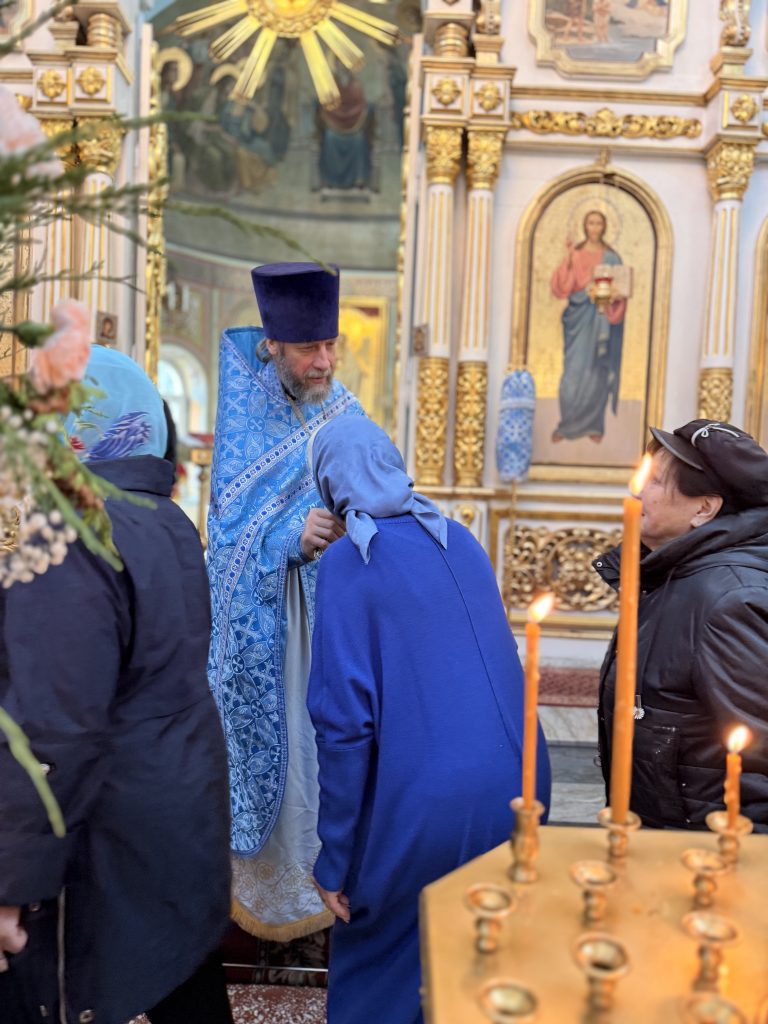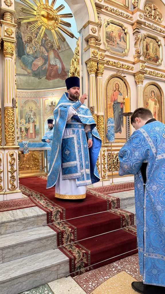 По заамвонной молитве было совершено Славление праздника перед иконой Покрова Пресвятой Богородицы.