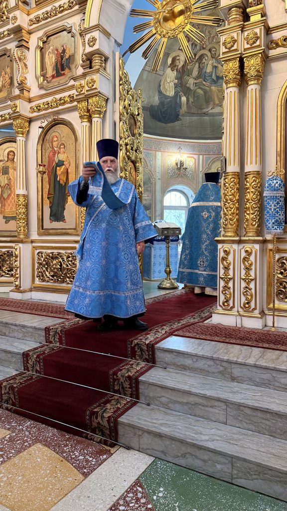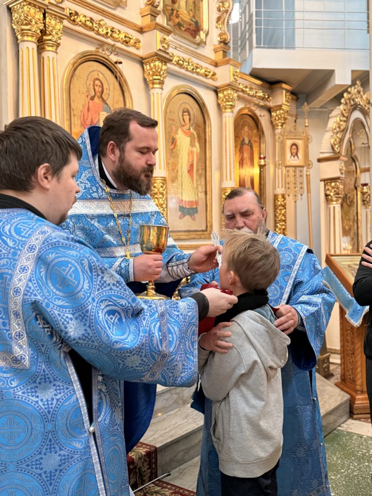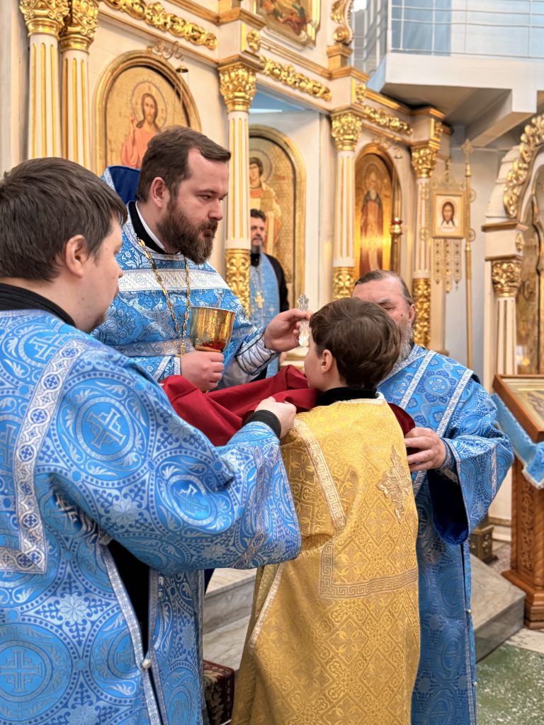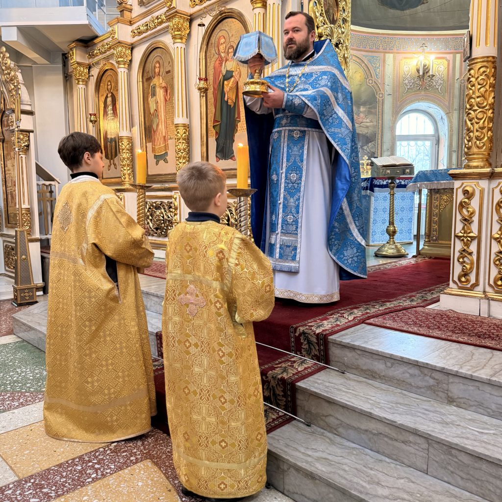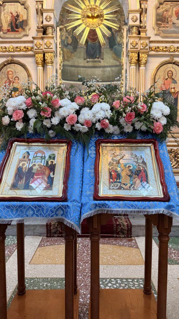 По заамвонной молитве было совершено Славление Господу Иисусу Христу и Его Пречистой Матери у праздничной иконы.